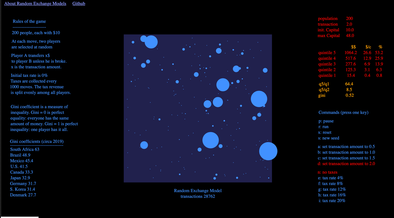 Having remembered the rules of the game, I decided to make a little game that I could play with. And think about. How fast does the initial distribution of money change from perfect equality to a stationary distribution? (A distribution that does not change with time, even though stuff still happens, i.e., money is still exchanged.) What would be the effects of taxation? How does the Gini coefficient (a measure of inequality) change with time and with change of tax policy? Etc.