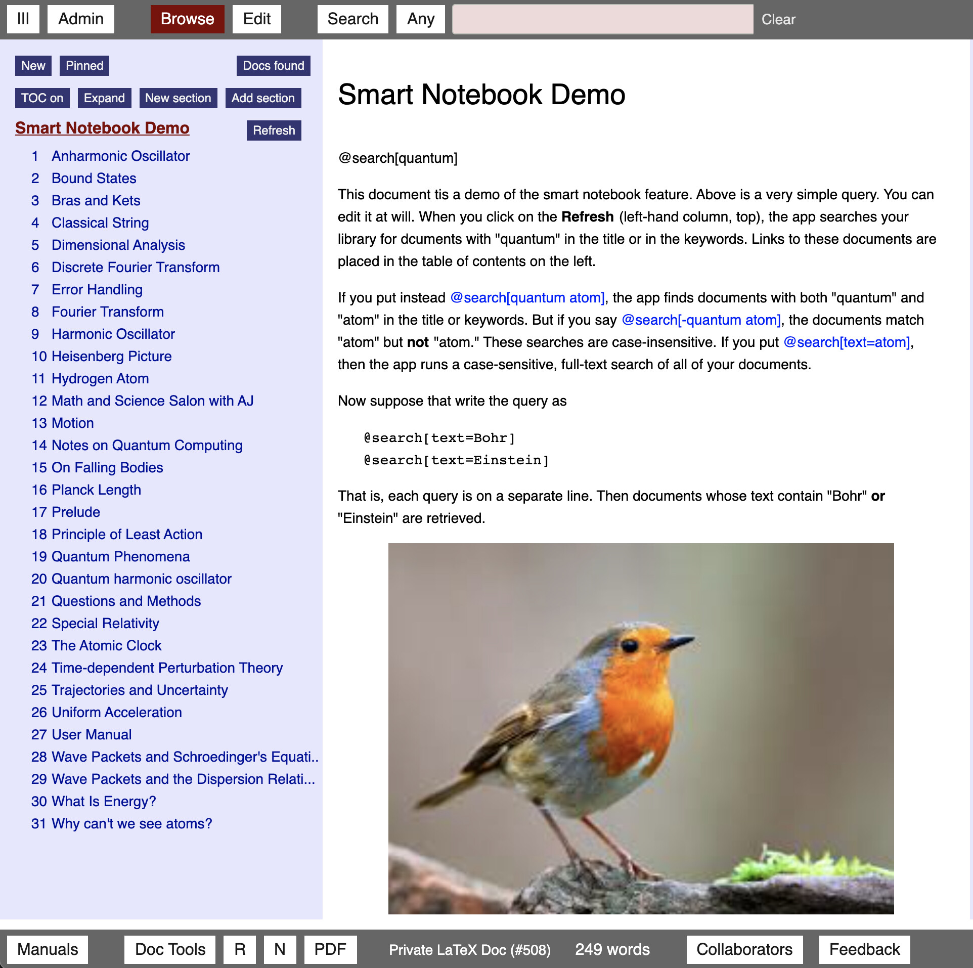 I’ve been using minilatex.lamdera.app both for writing mathy class notes and for taking random notes of all sorts. The search feature is pretty good at finding what I am looking for, but I decided to try something different: Smart Notebooks. The idea is that you write one or more queries in the document, e.g.,@search[elm], then press refresh to get a “notebook” whose table of contents consists of links that match they query. Click on any one of these links to view the document — like the one you see below.